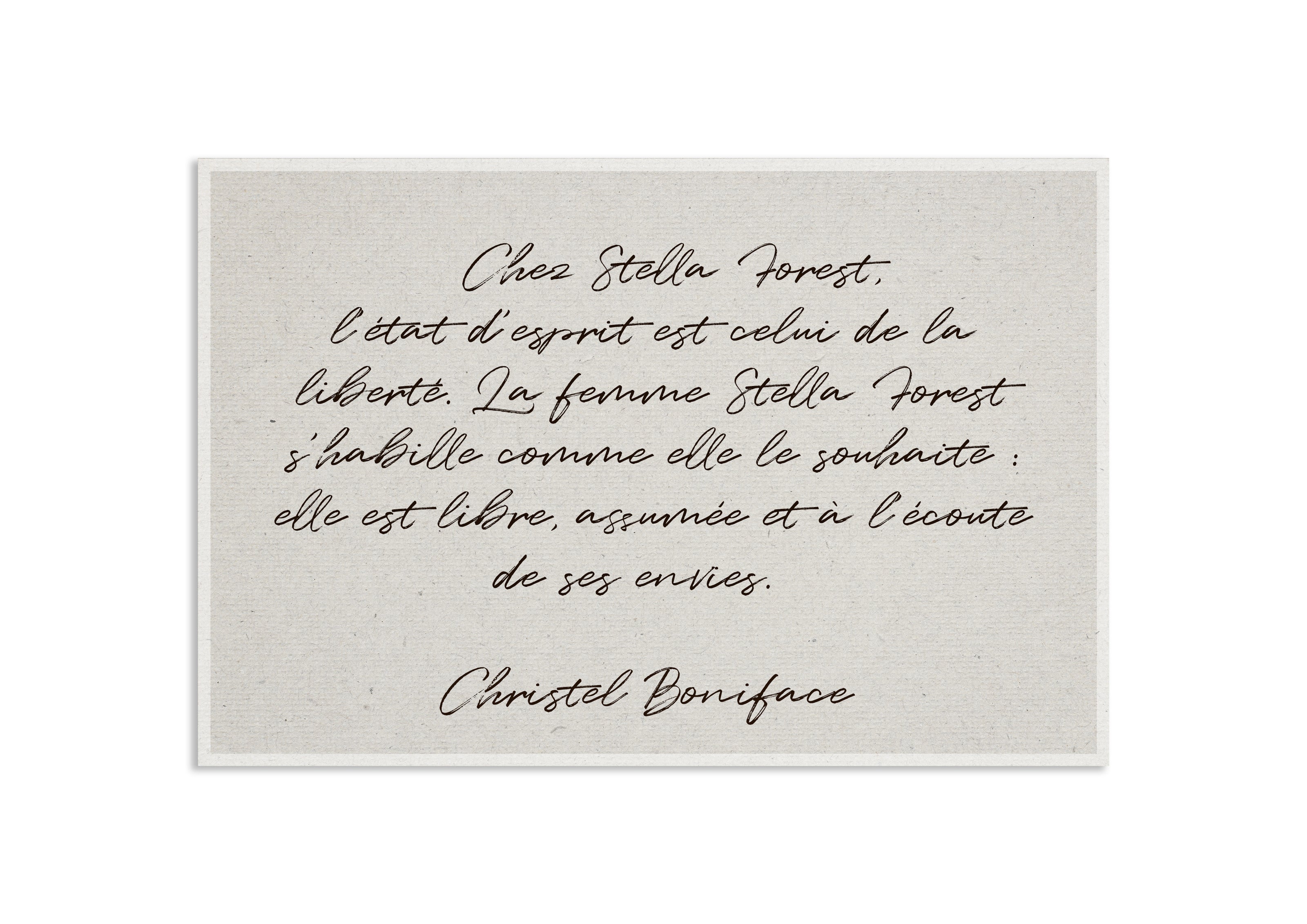 La ligne se prolonge à travers du linge de maison, du beachwear et des pièces Signature exclusives, conçues dans des matières naturelles. Fidèle à ses valeurs, Stella Forest s'adresse à des femmes libres et assumées, en quête de pièces élégantes, confortables et affirmées, reflets de leur personnalité et de leur audace.