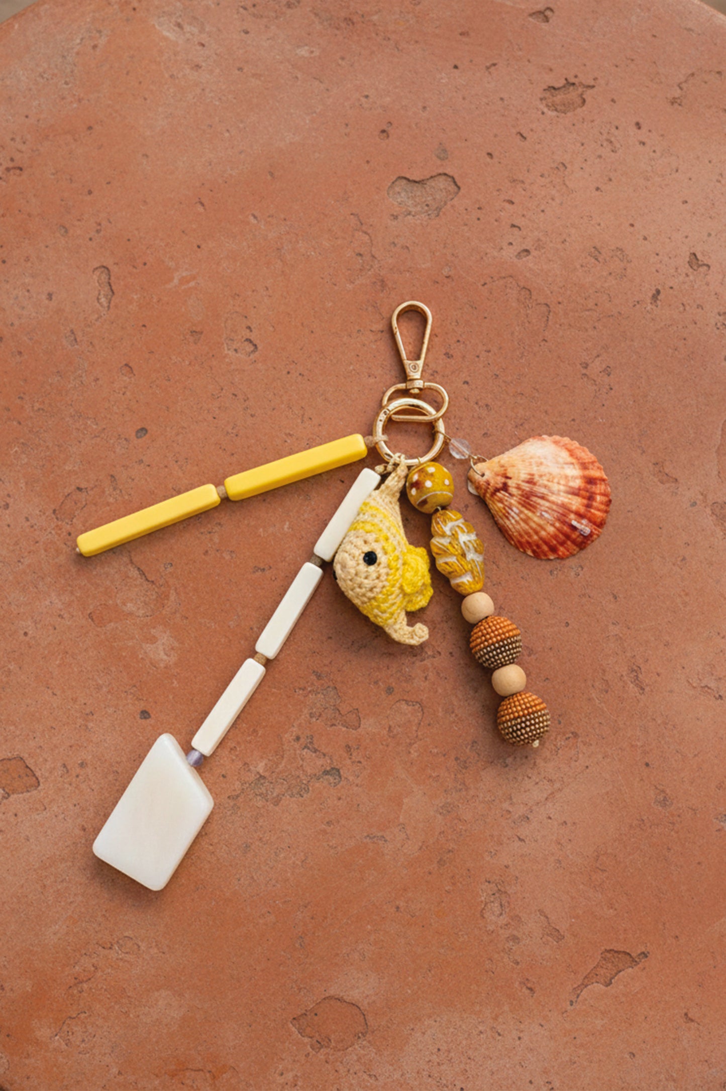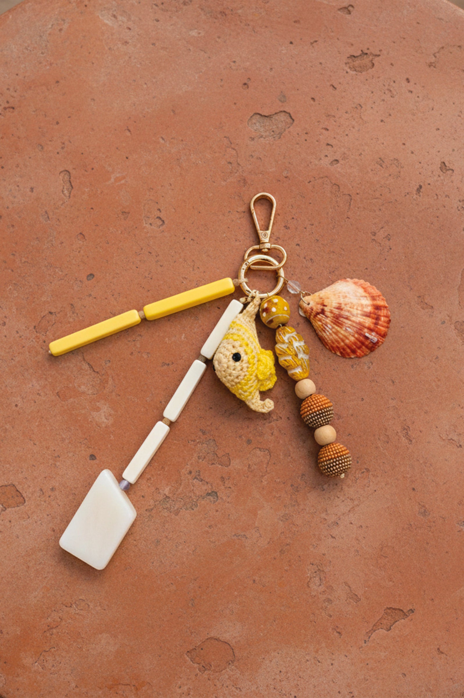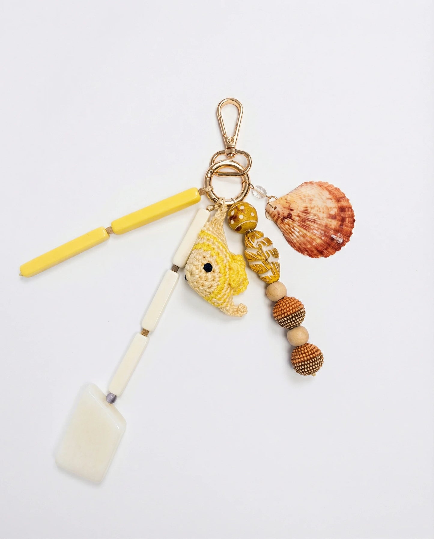 Charm porte-clefs en forme de poisson, agrémenté de coquillage et de pierres jaunes.