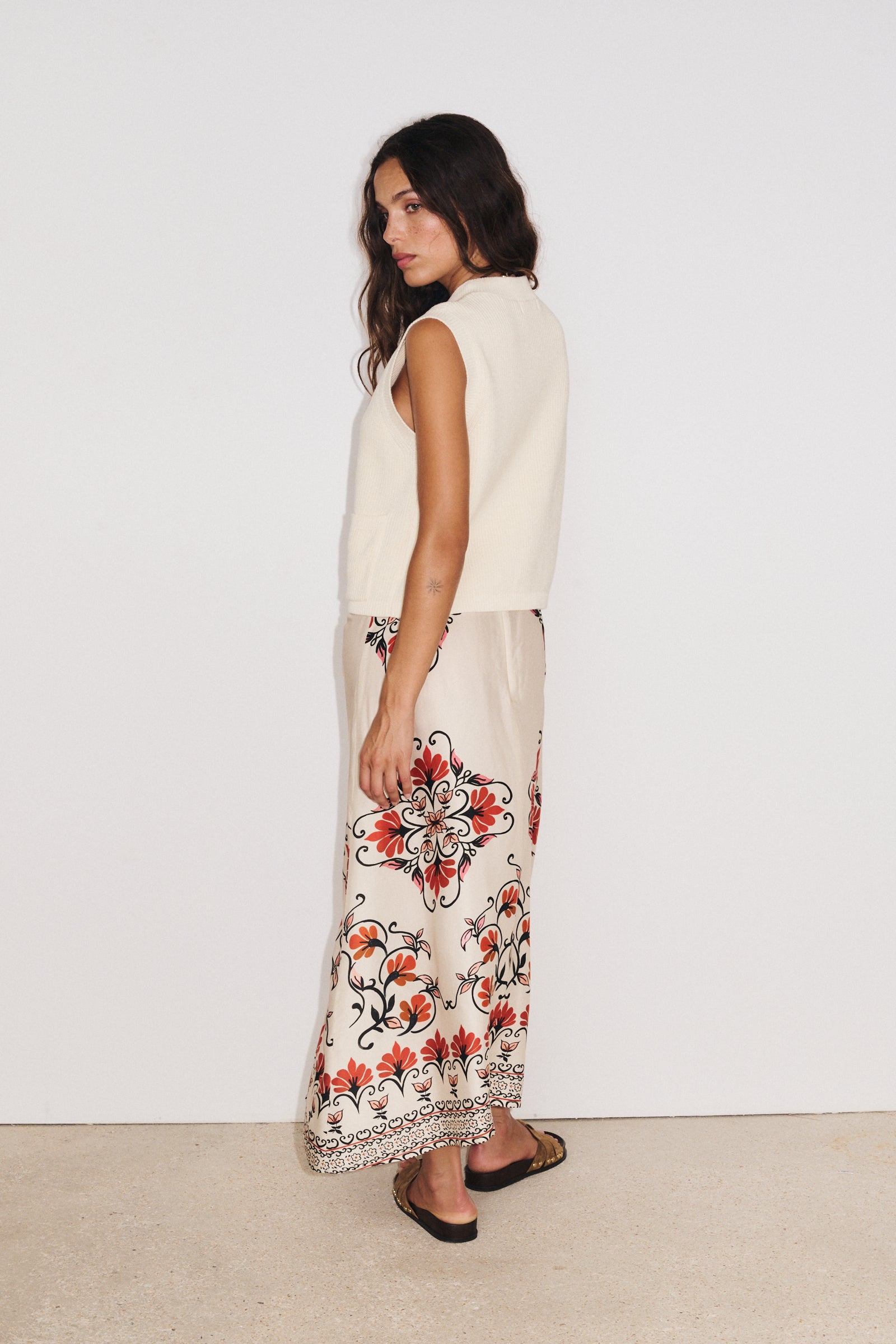 Ce modèle taille normalement. Portez le gilet Kim sur une chemise ou un t-shirt léger pour un look superposé élégant, ou associez-le à un pantalon fluide pour une silhouette contemporaine et raffinée.