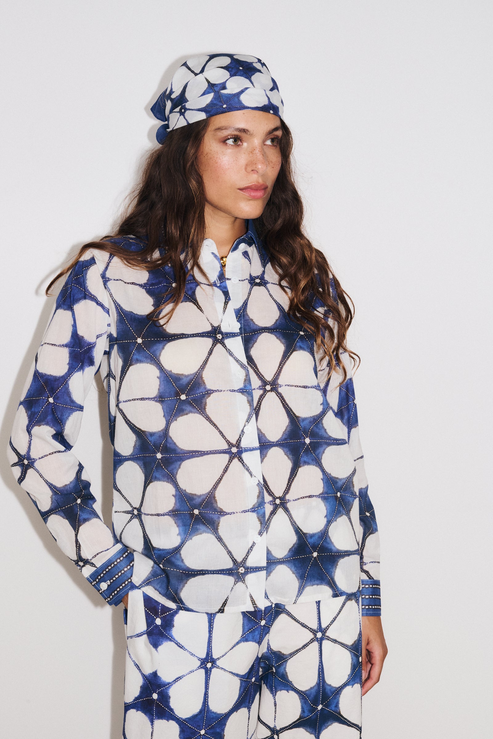 Wear it tucked into pants or a skirt to structure the silhouette, or leave it untucked over jeans for a casual chic look. Simple accessories will highlight the fabric's unique print.