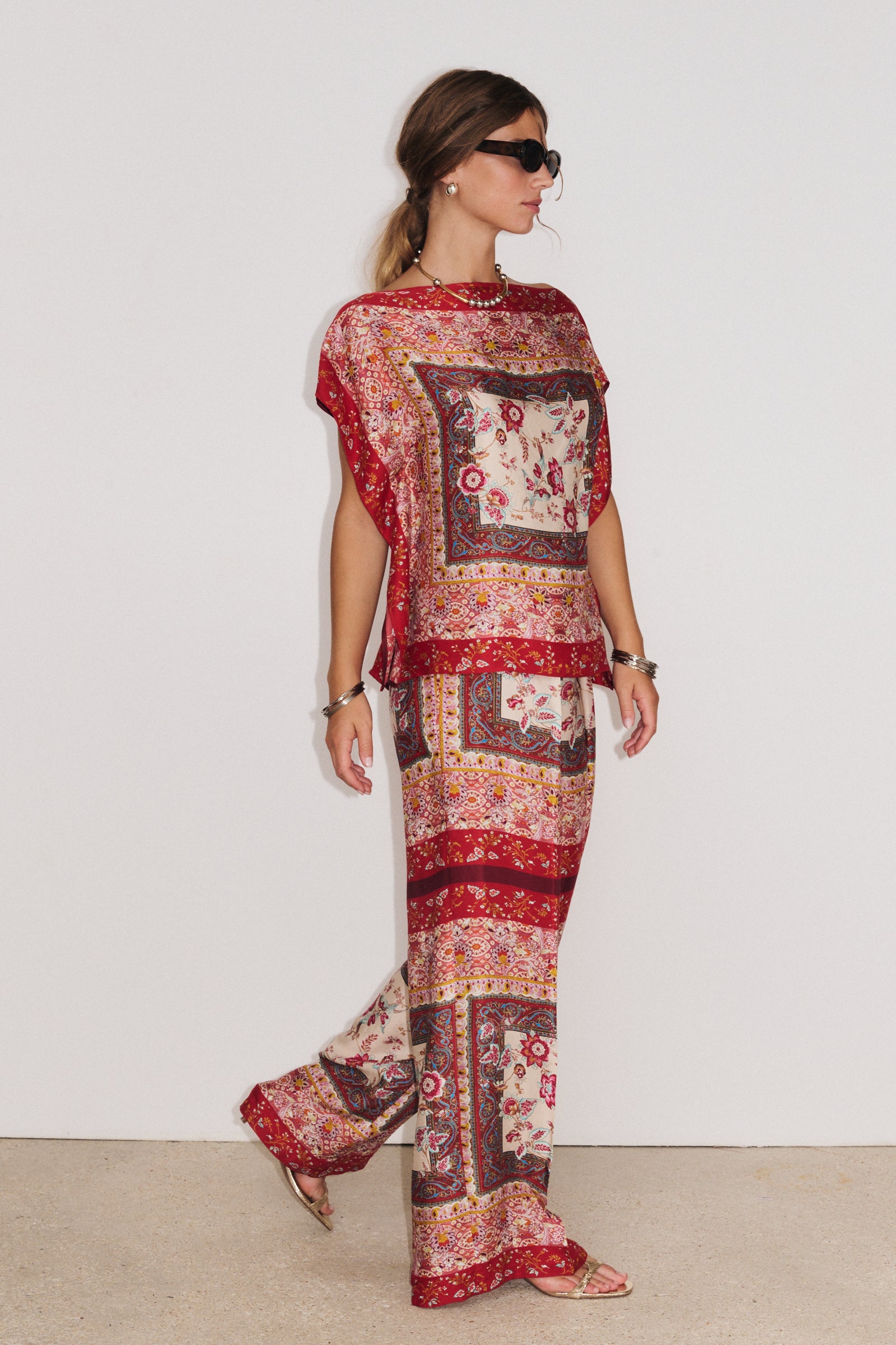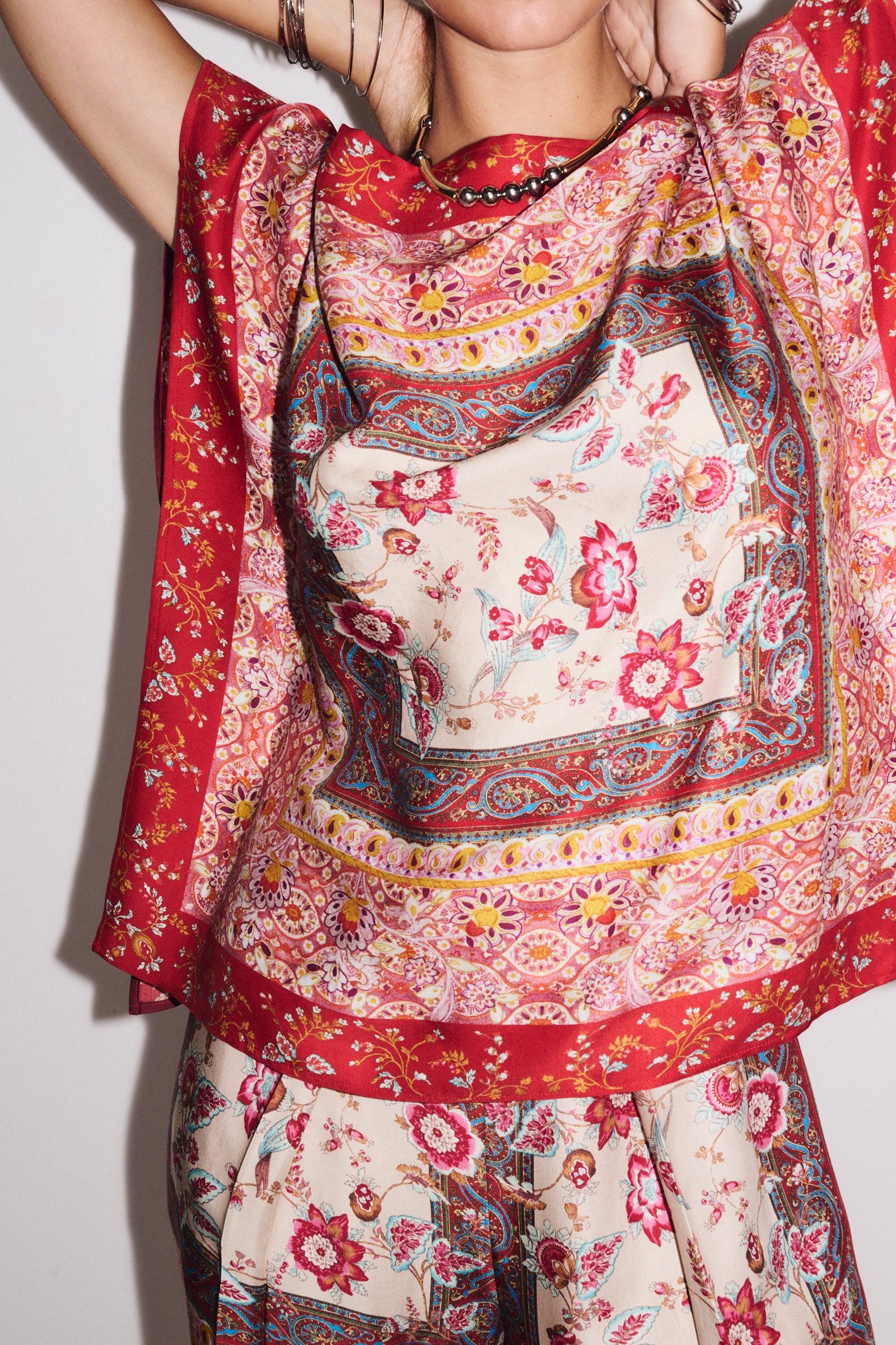 Inspired by silk scarves and crafted from fluid fabric printed in Como, the Romance tunic features a scarf-inspired trompe-l’œil effect for a chic and refined look. Versatile, it can be worn for both ceremonial occasions and casual outings.