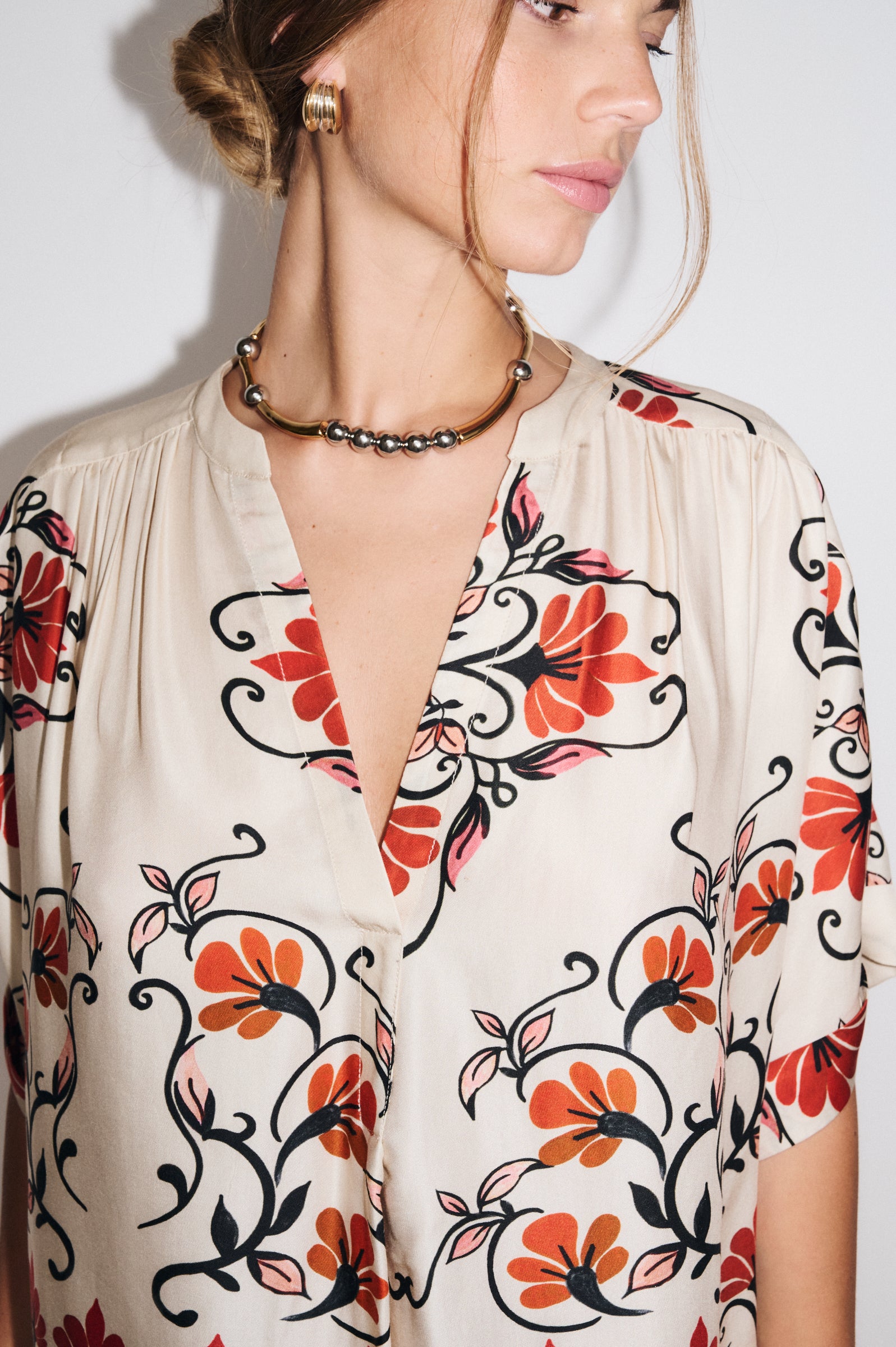 See the lookThe CLELIANA short-sleeved tunic, enhanced by an exceptional print made in Como, offers a modern and elegant look for both your everyday outfits and more formal ensembles.