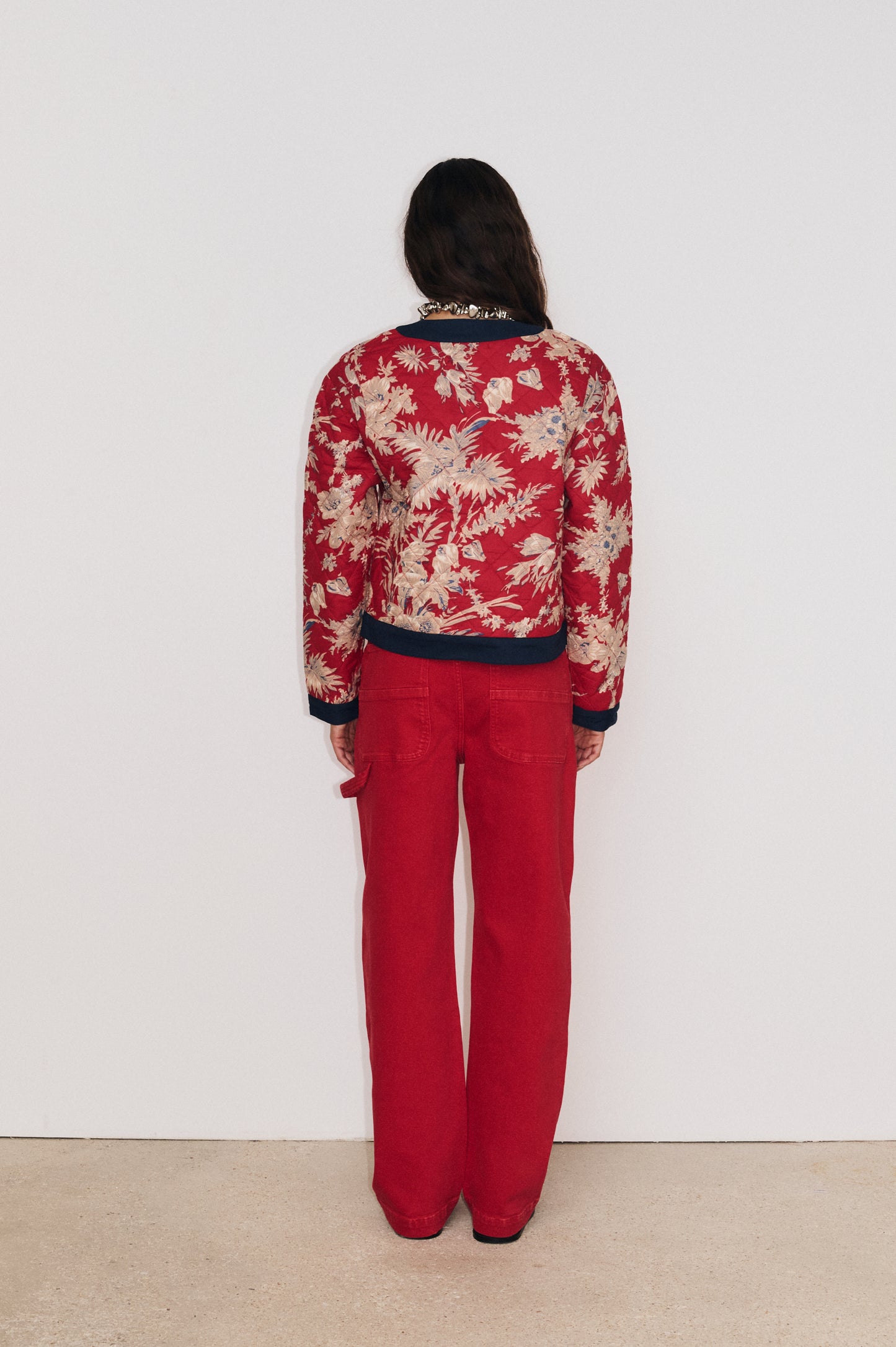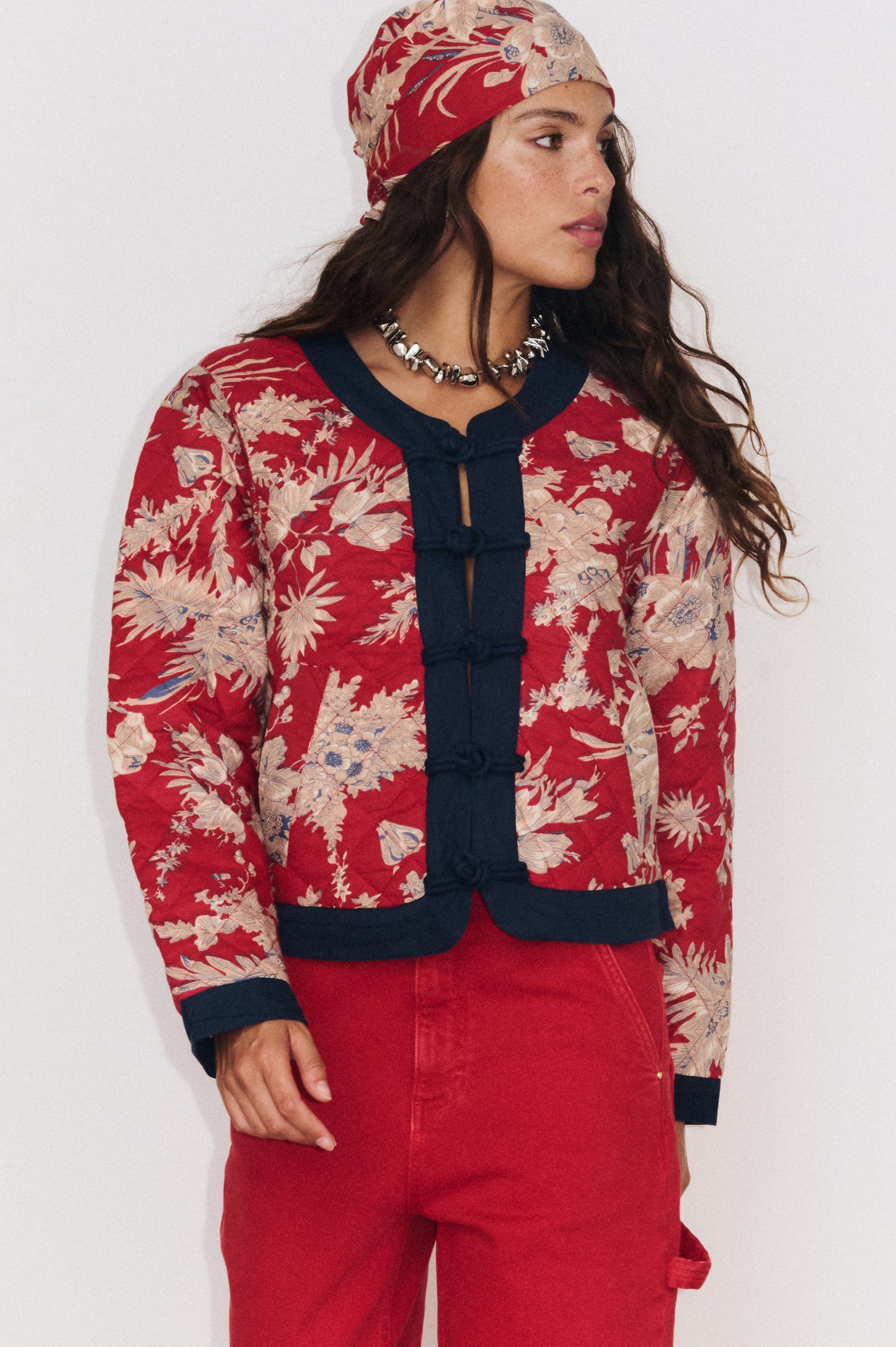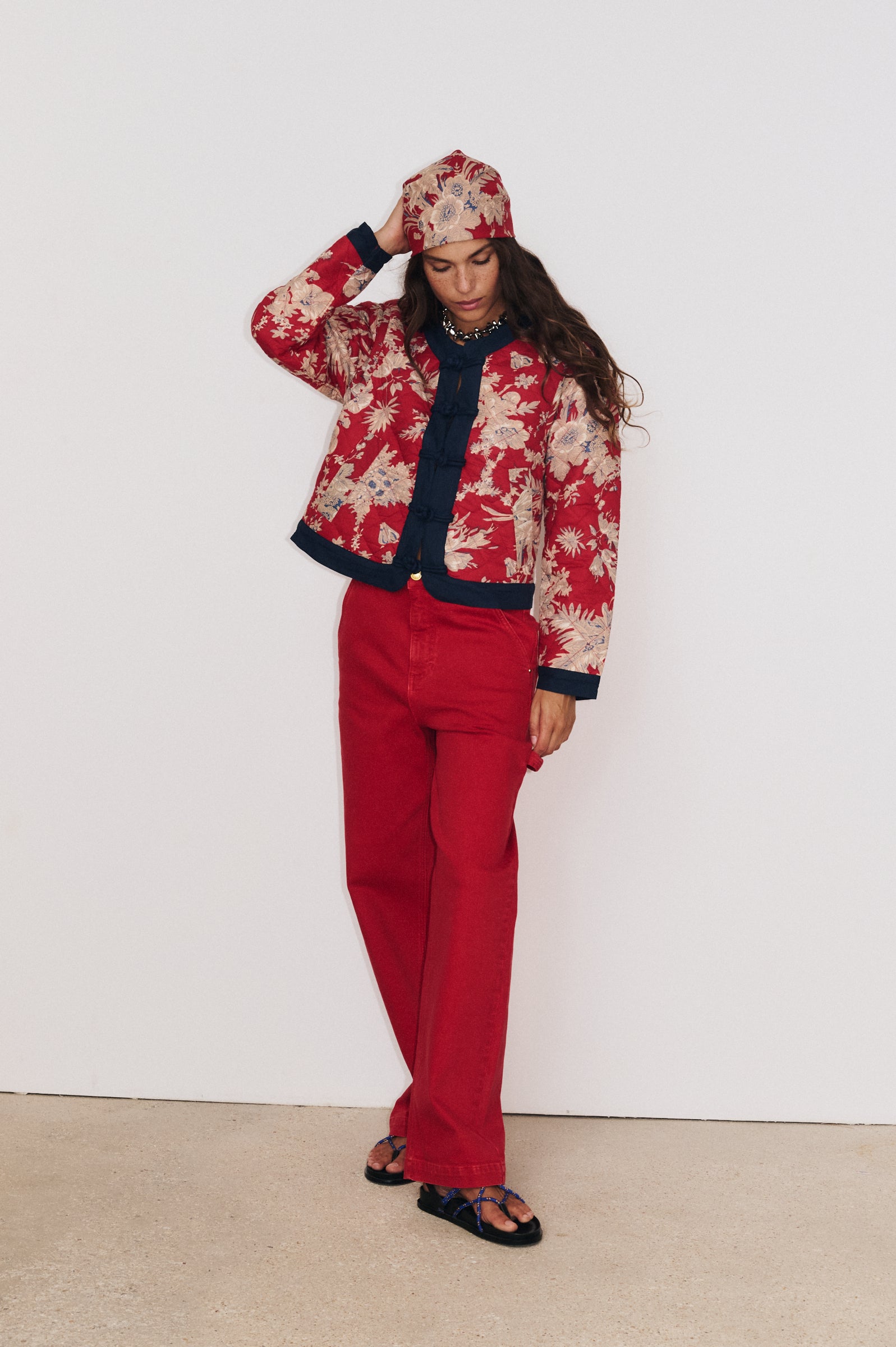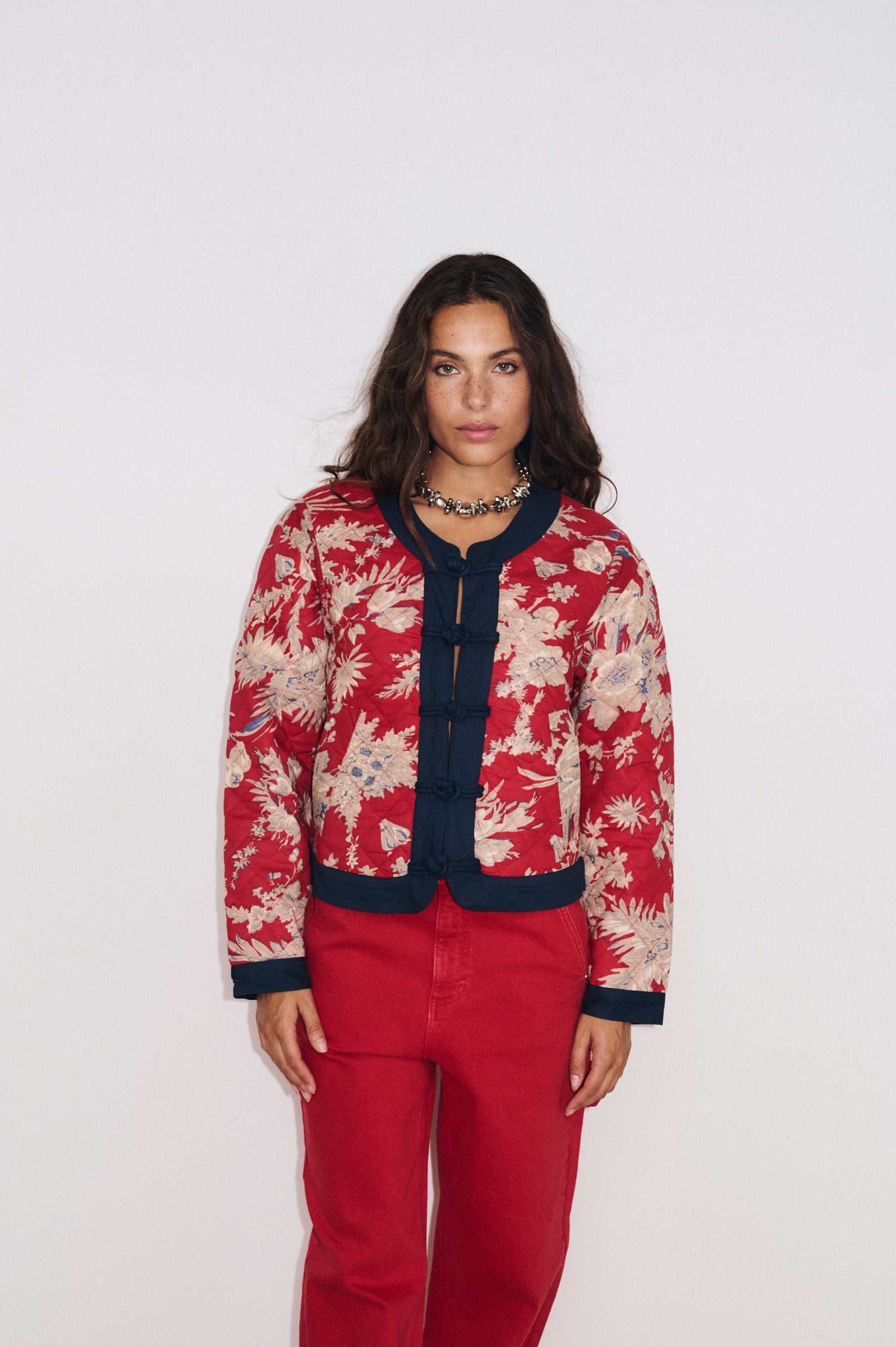 This boxy jacket stands out with its structured, modern design, combining comfort with a graphic, contemporary style. Quilted check detailing adds texture and character, while navy-contrast trims on the cuffs, body, and neckline highlight its tailored finish. Large cotton knot buttons, inspired by traditional Japanese jackets, bring a touch of originality and heritage. A red lining with white polka dots adds a playful yet elegant detail visible inside.