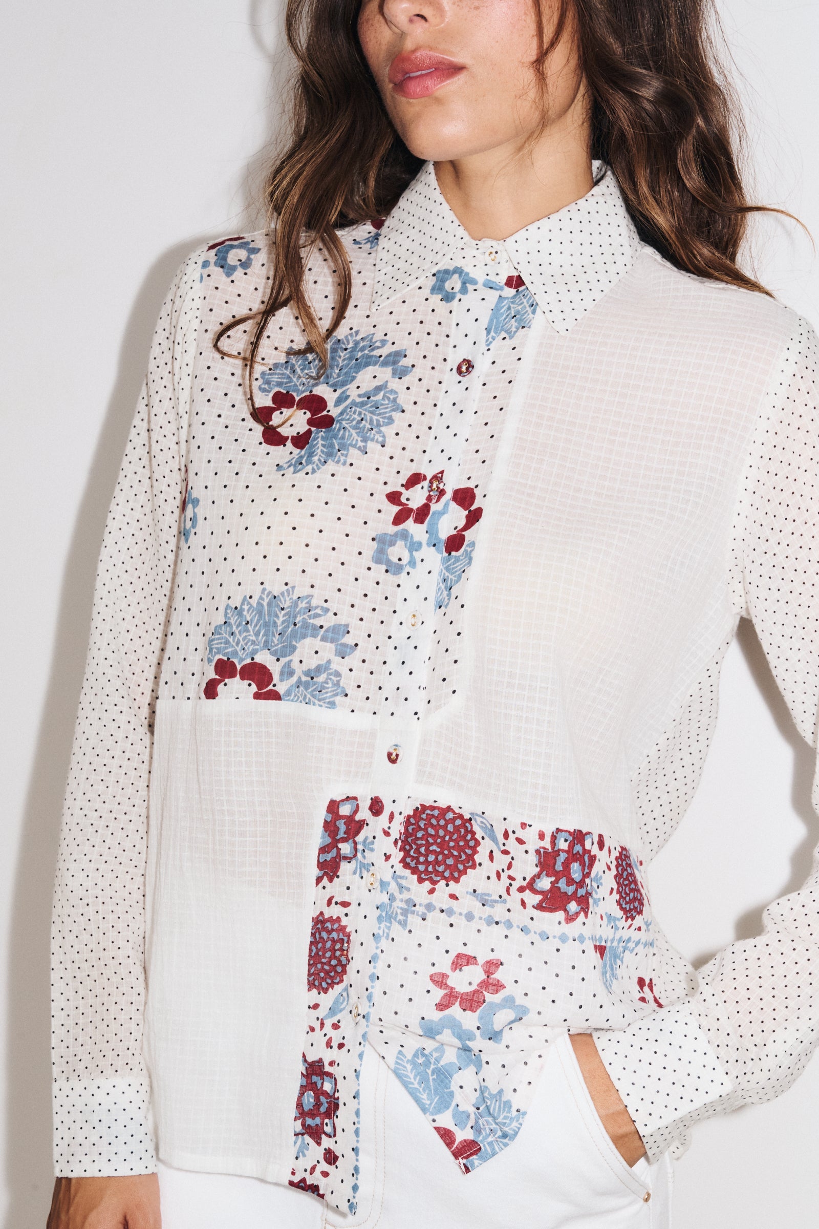 The Sunny long-sleeve shirt charms with its patchwork design, creating a unique mix & match effect. Floral prints blend with polka dot patterns to add character to the piece. Its cut follows a classic shirt fit, offering a silhouette that is easy to wear daily. Versatile and modern, it pairs naturally with jeans for a simple, stylish look.