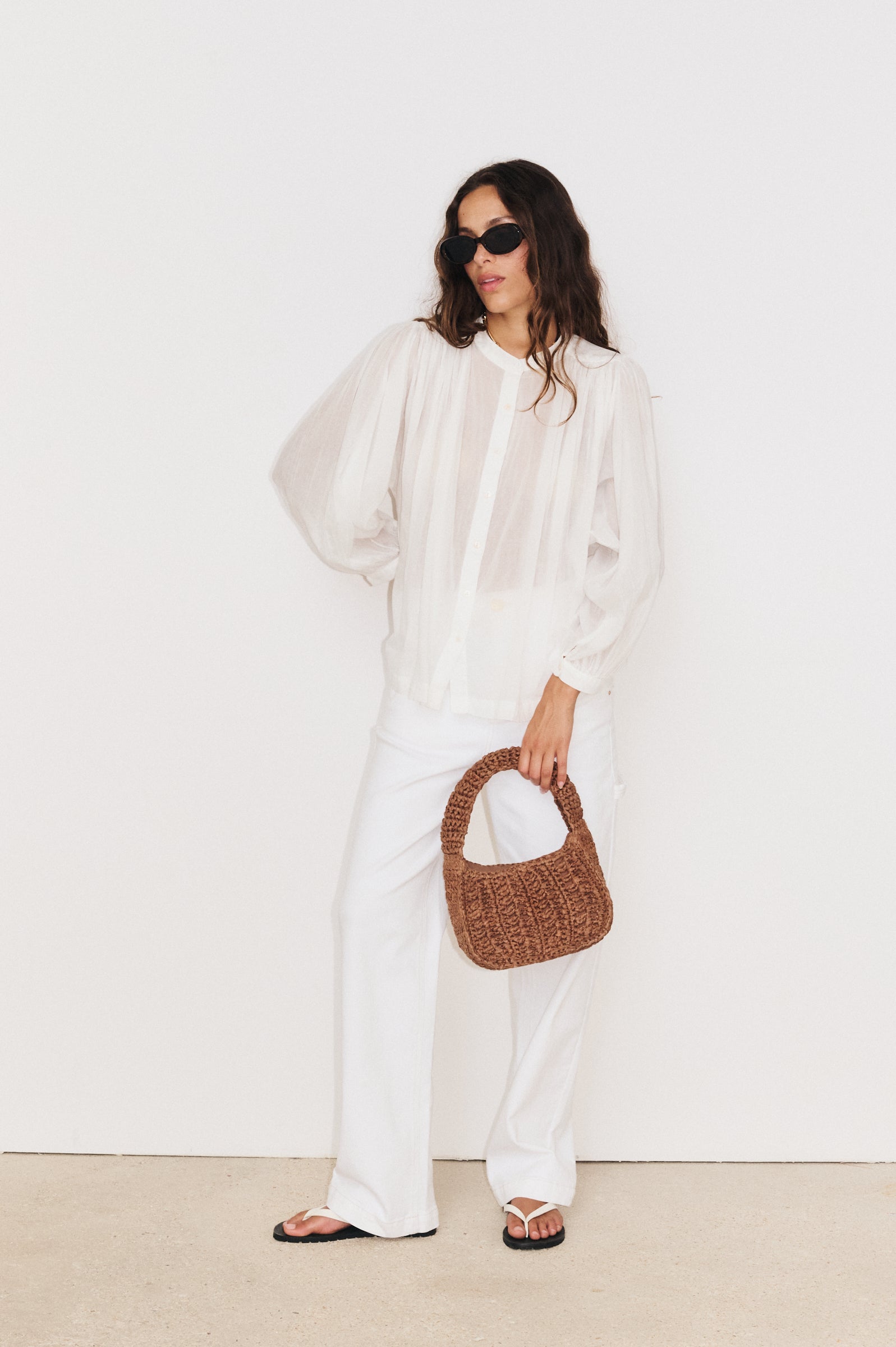 Pair it with light-wash jeans, fluid trousers, or a skirt for a natural summer look. Wear it tucked in or loose depending on the desired effect, letting its volume and lightness shine.